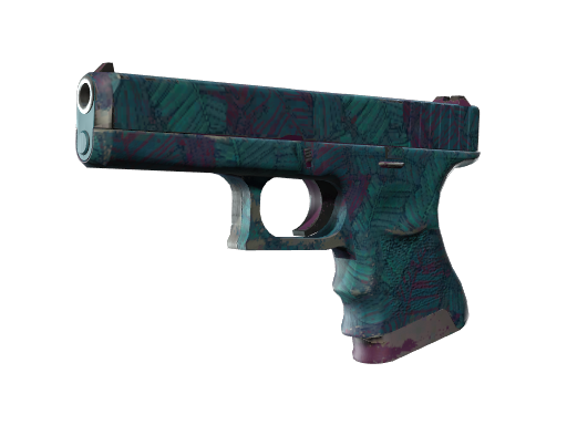 The Glock-18 | Synth Leaf (Field-Tested) is a serviceable first-round pistol that excels against unarmored opponents. It features a unique teal and purple hydrographic pattern of overlapping leaves, adding a striking visual element to its functionality.