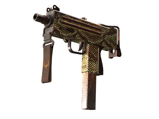 The MAC-10 | Hot Snakes (Battle-Scarred) is a specialized SMG skin that features a custom bronze snakeskin pattern and a coiled snake design beneath the wire form butt. It is known for its high rate of fire, though it comes with poor spread accuracy and high recoil.